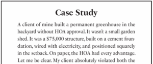 For example, in several of the chapters, readers will find boxed “case studies” that describe actual situations where homeowners confronted their HOAs and won. Each story highlights the problem, the relevant statutes, and the strategy that turned the outcome around. The goal is not to tell war stories, but to demonstrate that these methods work when applied carefully and consistently. Homeowners are shown what success looks like and how to replicate it.