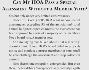But then, earlier this year, I read a recently published “homeowner-side” HOA book written by a former employee of mine who now runs his own firm, and who has styled himself as a “thought leader” and “pioneer” in this area of the law. I was deeply disappointed. Not only did it appear to me to be largely filled with meaningless platitudes, generic, recycled talking points, and trite superficial suggestions masquerading as actual useful information, but it betrayed a shockingly superficial understanding of the Davis-Stirling Act. In some parts of the book, what the author didn’t say could easily be misunderstood, resulting in negative consequences for the unwary homeowner. And even worse, the book contained some complete misstatements of the law (i.e., the statements were just wrong). I discuss a couple of the more serious errors in my response to Q3 below. Anyway, my disappointment in that book gave me the push to finally write the book that I should’ve finished in early 2019: an easy-to-read, statute-based roadmap that actually teaches Californians how to fight back and win against bad HOAs.