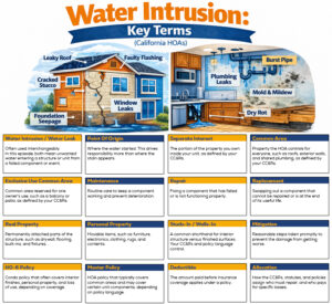 To see how these definitions and principles apply in practice, you may also want to review the related Fact Sheets in this Water Intrusion series, including “HOA Water Damage: Who Is Responsible When Water Invades Your Unit?” and “HOA Water Damage Claims: What the HOA Pays, What You Pay, and Why.” You can also watch Part 1 of my podcast episode titled “Water Intrusion in California HOAs (Part 1),” which walks through these issues step-by-step in greater detail.